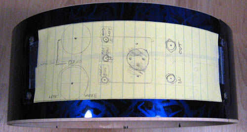 Marque el centro de cada agujero en la plantilla y cinta abajo temporalmente. Marque el centro de los agujeros utilizando un objeto puntiagudo como el punto de un clavo o un punzón para hacer mella en la superficie. Los agujeros de montaje de la toma XLR se perforan mejor con el gato sentado en su agujero, así que la alineación es perfecta.
