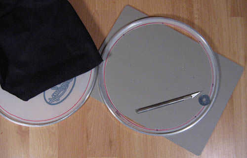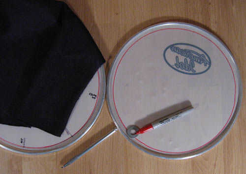 Los de la marca es opcional, pero una buena idea. Quiere dejar una tira alrededor que es ligeramente más gruesa que la cáscara del tambor. (si corte la cabeza entera, el anillo será apenas Deslice alrededor del exterior de la cáscara) La tira de la cabeza se encuentra en la cáscara, y el borde lo mantiene apretado.
