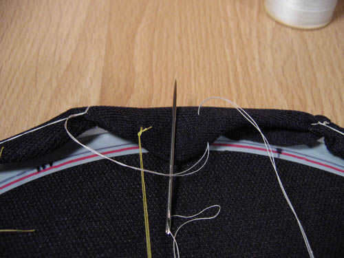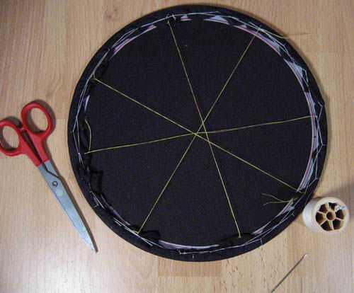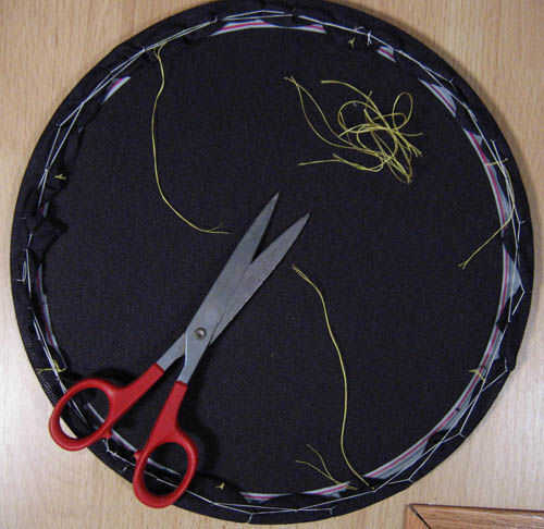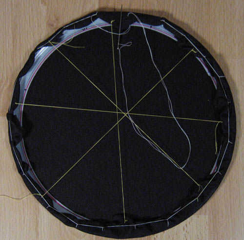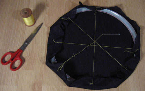 Tomar más hilo y coser alrededor del borde. Ruede para arriba el paño un poco para darle algo a retener (parrilla paño es un tejido suelto). Sólo coser la tela en la parte posterior de la cabeza, _not el front_. Esta puntada es similar a la manera que usted haría la cinta de "atrapasueños". NativeTech.org tiene mejor instrucción en la técnica. Por cada puntada, en lugar de ir alrededor de un anillo de vid o de metal, coser a través de la tela de rejilla. Realmente, este hilo no toma cualquier tensión en la tela hasta llegar a mitad de camino alrededor del círculo. Cuando haces una vez alrededor, se superponen un poco. Volver al principio y tirando del hilo con los dedos para apretar los puntos de sutura. Usted debe ser capaz de estirar un poco la tela y haz agradable e incluso en la parte delantera.