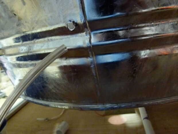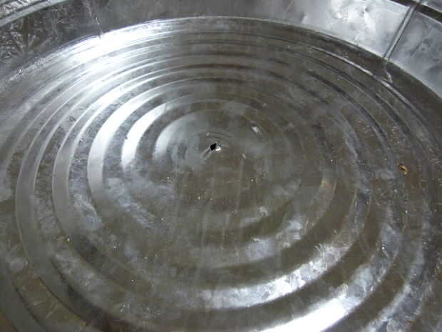 El último paso es cortar el agujero para el desagüe en el piso e instale al montaje del desagüe. En realidad compró una instalación de desagüe más pequeños pero jodido el primer agujero lo que había que conseguir un segundo. Palabra para el sabio - tijeras son una pobre forma de mangle cortado a través de una tina galvanizada. El lado-corte de metal poco de Dremel era perfecta para esto y deseo que había pensado en él antes. También deseo que todavía tenía una Dremel real en lugar de mi modelo inalámbrico bebé (aunque esto funcionó muy bien para el techo de starfield). Comió a través de las pilas como un loco. Después de que fue perforado el orificio correcto, he insertado el montaje del desagüe en el orificio. Luego perforar cuatro agujeros a través del metal y había unido todo el conjunto con remaches y arandelas. Las tapas de los remaches se presentaron luego hacia abajo para quitar cualquier borde filoso. Por último, liberalmente calafatear alrededor del borde de la acequia para prueba de fugas lo. Sólo quería agua bajando por el agujero de drenaje, en ninguna otra parte.