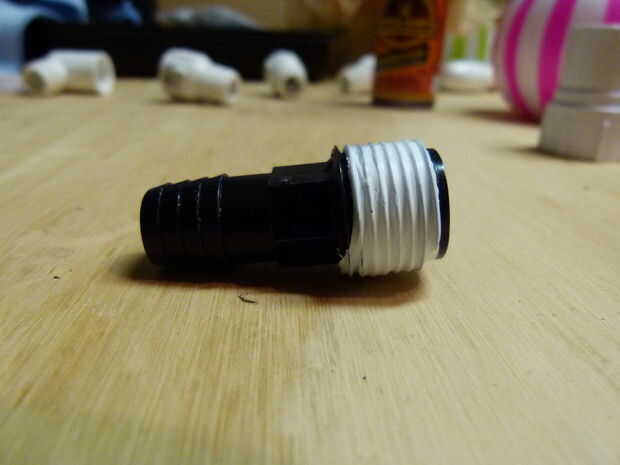 Este es claramente el más fácil juguete para crear. Simplemente Envuelva el extremo roscado con cinta para cañerías y listo. Ahora si los niños quieren tener un lugar fácil para llenar globos de agua, enchufe en uno de los conectores de componentes y el agua va a tirar de ella en el agua globos cuando se pulsa el botón adecuado.