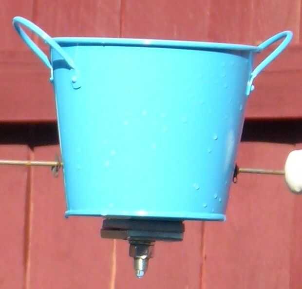Pero me estoy adelantando. Primero tenemos que pesan los cubos. No se puede tener demasiado peso, o el agua no caiga correctamente los cubos. Demasiado poco y podría tener cubos que caiga demasiado rápido o no derecho ellos mismos después de vuelco. He encontrado algunos grandes arandelas pesadas en la sección eléctrica en Home Depot que hizo el trabajo perfectamente. Para crear este contrapeso, empiece por taladrar un agujero de 1/2" directamente en el centro del cubo. Coloque dos arandelas directamente encima de este agujero y luego deslice el perno a través de ellos. Ahora deslice las tres arandelas restantes en la parte inferior del perno y casquillo de la tuerca. Ahora tenemos un cubo correctamente ponderado.