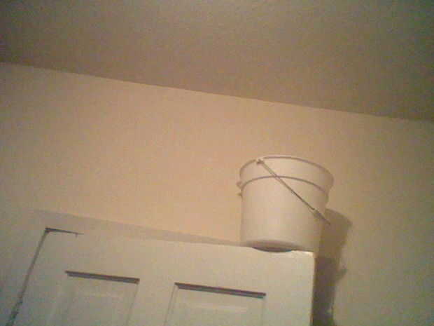 con cuidado, coloque el cubo encima de la puerta para que si alguien viniera caería sobre ellos PS: lo que no prueba en sí mismo.