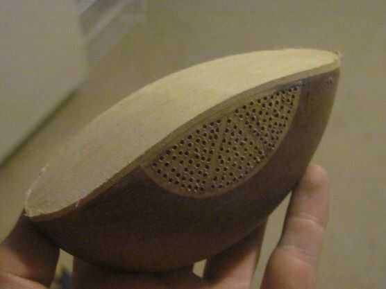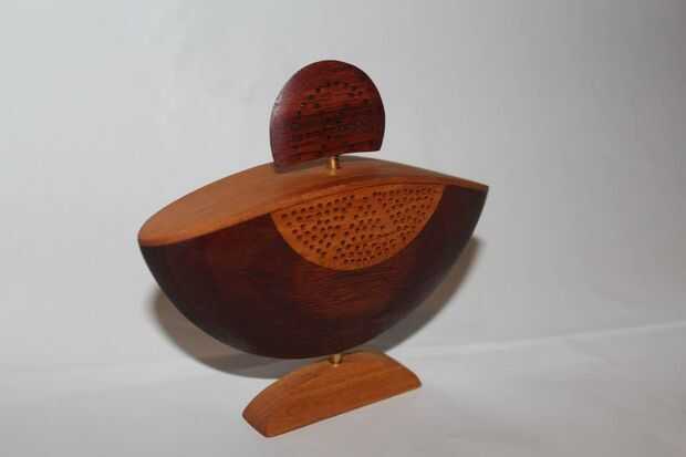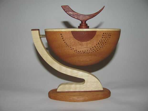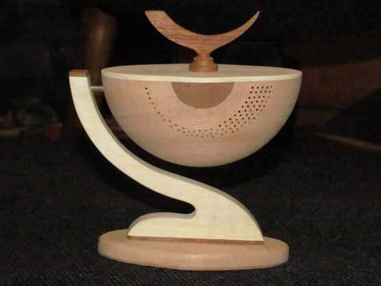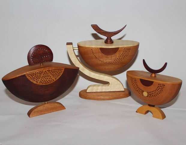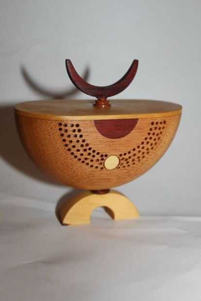 Estas delicadas piezas se llaman bolas de partido. Un tazón de fuente fino es convertido y luego cortar por la mitad. Entonces es reglued en un eje diferente a otra forma. En mi 3 piezas he adornado con incrustaciones, piercing con una dremmel y otras formas que fueron fromed por aserrar, lijar y taladrar.