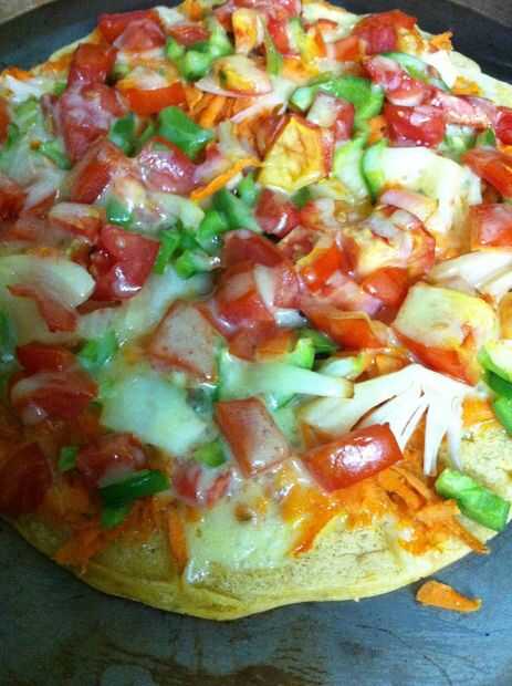 Pizza pan plano de trigo entera es fácil y rápido para hacer la receta. Su hecho como pan de trigo integral (Chapathi/roti) y después montar como una pizza. Se cuece en la estufa sin usar el horno. Reposo tiempo o preparación previa no se requiere pa