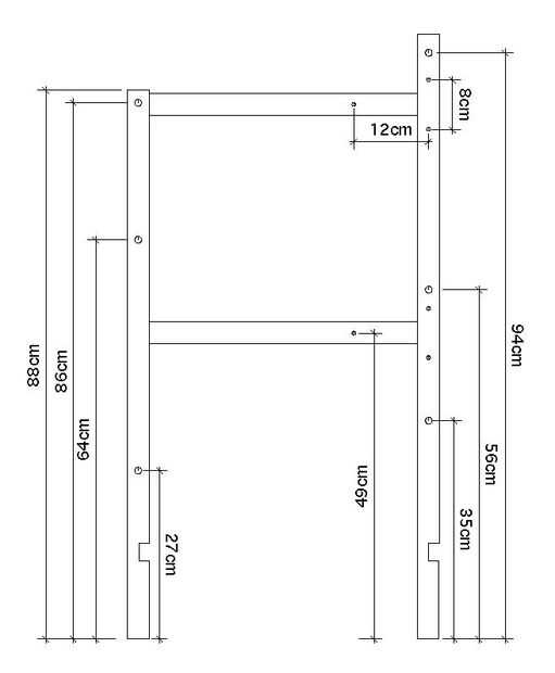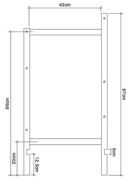 El esquema adjunto muestra las dimensiones que hemos utilizado. El ángulo de las rampas es de aproximadamente 10 grados y hemos añadido agujeros en 2 puntos para la bomba. Esto permite colocarse en una posición más baja para los niños más pequeños y una posición más alta para los más viejos de la bomba. El diseño del bastidor da soporte sólido a las canaletas pero también permite un acceso máximo a las canaletas durante la reproducción. Dos travesaños el marco firmemente en el localización de los orificios cortadas en los lados de la base y proporcionar una plataforma plana de la sección final del canal de canal para sentarse.