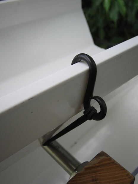 Las canaletas llevó a cabo en el marco usando mini cuerdas del amortiguador auxiliar. Encontramos ronda terminó, ganchos de plástico que suministra el ajuste sobre los bordes del canal en un camping tienda (Decathlon) pero hobby tiendas probablemente tendrá algo similar. Tamaño depende del estilo de canalones está usando para las rampas.