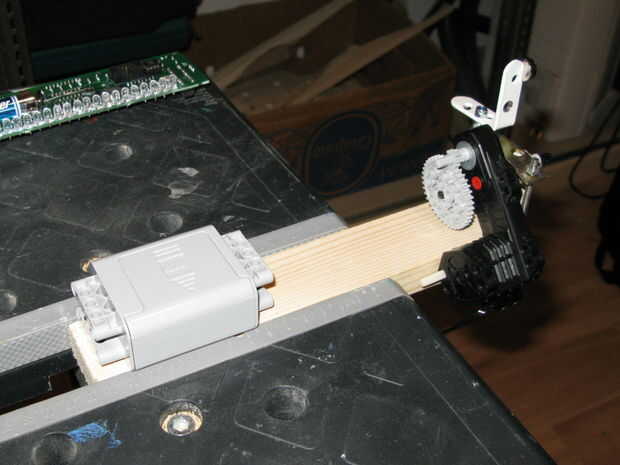 Apriete el paquete de baterías de Lego a la madera y conectarlo al motor.