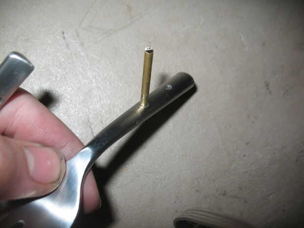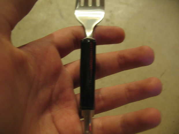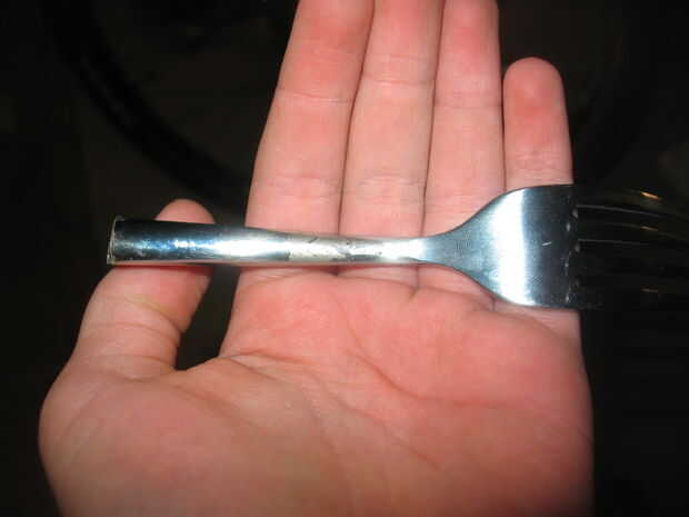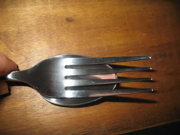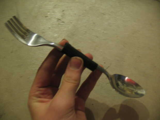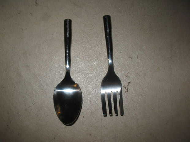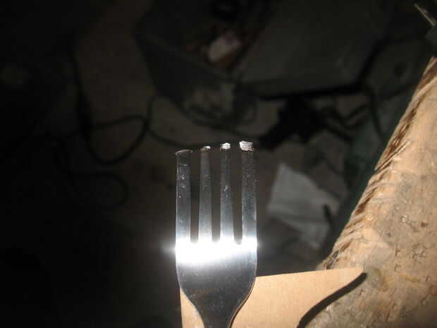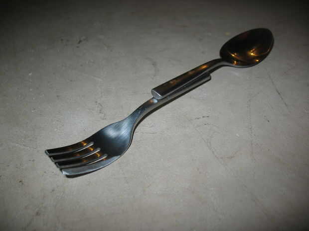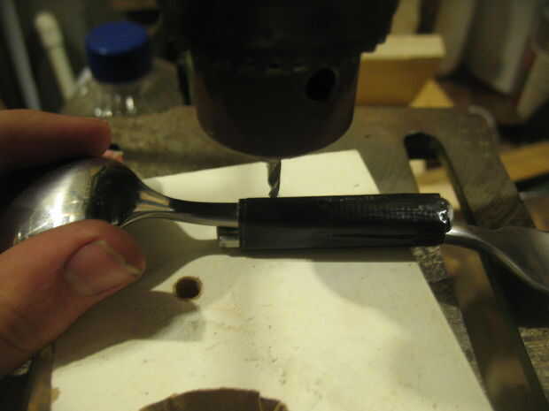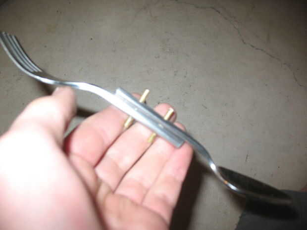 Compré dos juegos de cubiertos: un conjunto de dos horquillas de 8" y un conjunto de dos cucharas de 6.5" (total de $4). Usé una amoladora cortar los mangos y recortar las puntas de la horquilla para que coincida con el cuenco de la cuchara. Doblé los extremos cortados con mi amoladora de banco. A continuación, alisar las púas con una dremel y suavemente una de las puntas afiladas (Asegúrese de embotar el borde un poco; realmente no quieres cortar tu boca abierta). Grabado los mangos juntos, uno encima del otro. Usé un taladro para perforar dos agujeros (diámetro de 1/8"), aproximadamente 3/4" de apart, en las manijas apiladas. Luego corte dos longitudes de perno de cobre amarillo un poco más grande en diámetro que los agujeros, manchada con epoxy, empujada las clavijas en los agujeros de la horquilla y martilló la cuchara en el tenedor. Una vez seco el epoxy, utilicé la dremel (¡ otra vez! Yo uso mucho esa cosa) y los pernos de tierra por lo que fueron al ras con la superficie. Finalmente, sacó la cinta y corrió las manijas Unidas y pasadores con un papel de lija de grano 800.