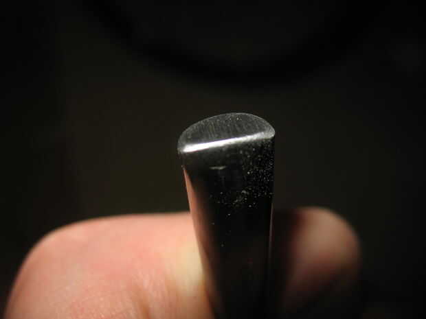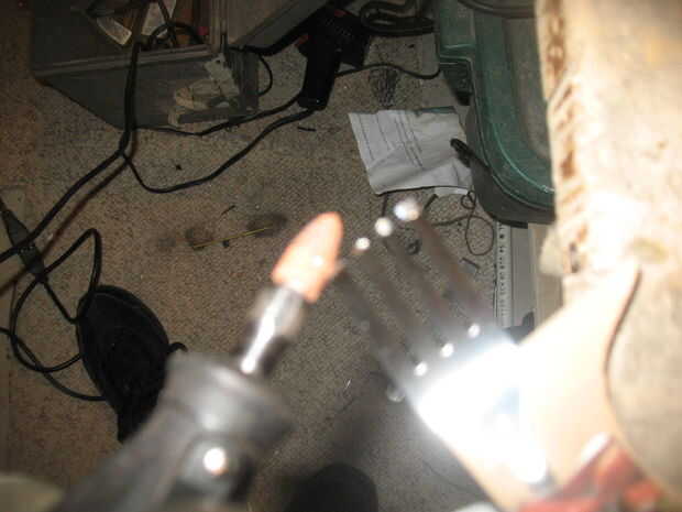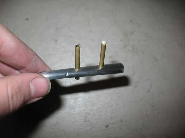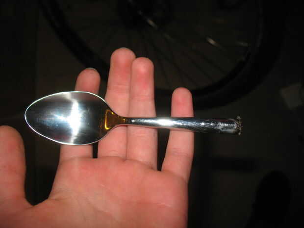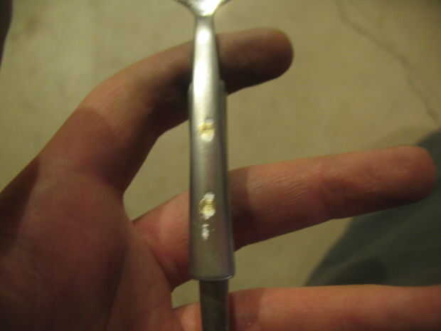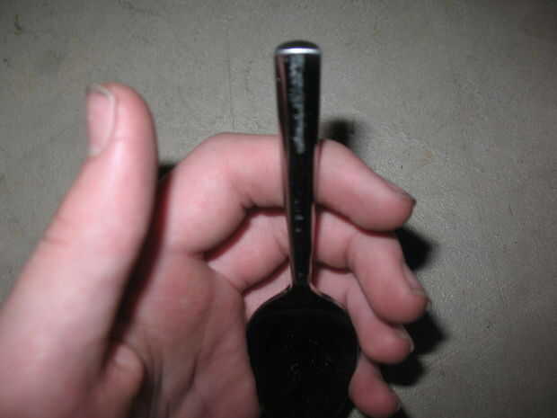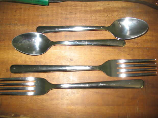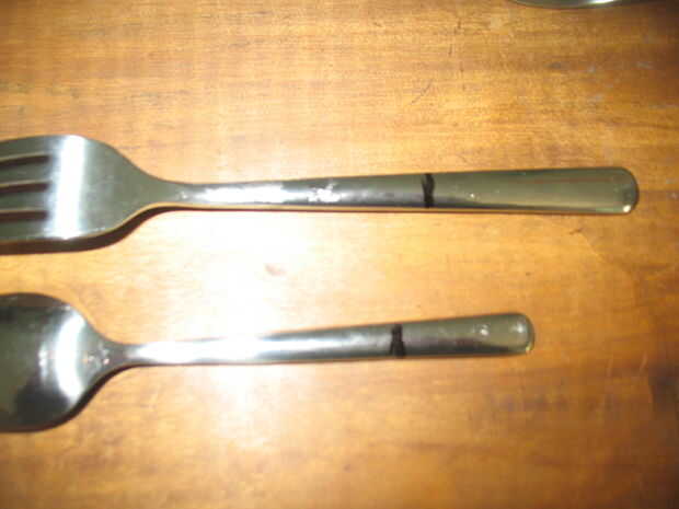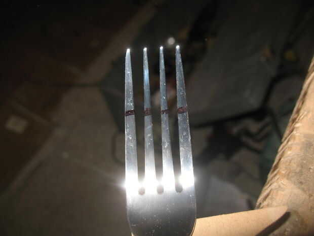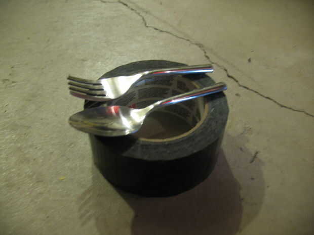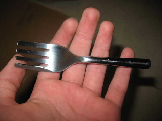 Compré dos juegos de cubiertos: un conjunto de dos horquillas de 8" y un conjunto de dos cucharas de 6.5" (total de $4). Usé una amoladora cortar los mangos y recortar las puntas de la horquilla para que coincida con el cuenco de la cuchara. Doblé los extremos cortados con mi amoladora de banco. A continuación, alisar las púas con una dremel y suavemente una de las puntas afiladas (Asegúrese de embotar el borde un poco; realmente no quieres cortar tu boca abierta). Grabado los mangos juntos, uno encima del otro. Usé un taladro para perforar dos agujeros (diámetro de 1/8"), aproximadamente 3/4" de apart, en las manijas apiladas. Luego corte dos longitudes de perno de cobre amarillo un poco más grande en diámetro que los agujeros, manchada con epoxy, empujada las clavijas en los agujeros de la horquilla y martilló la cuchara en el tenedor. Una vez seco el epoxy, utilicé la dremel (¡ otra vez! Yo uso mucho esa cosa) y los pernos de tierra por lo que fueron al ras con la superficie. Finalmente, sacó la cinta y corrió las manijas Unidas y pasadores con un papel de lija de grano 800.