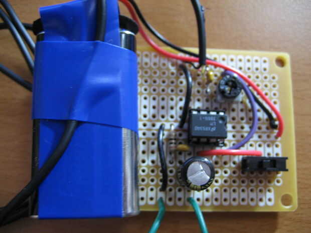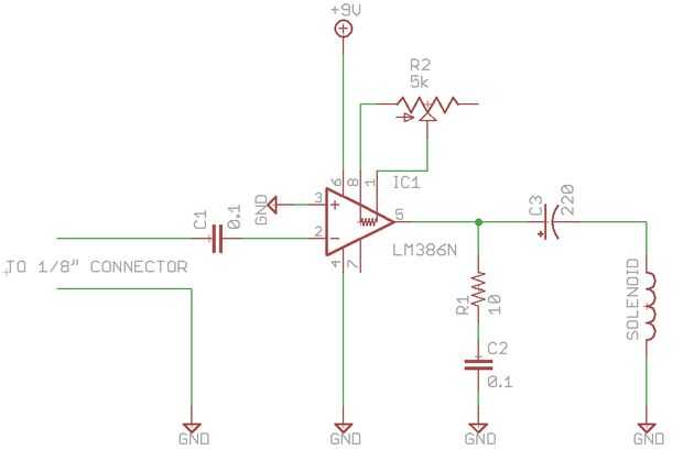 Arme el circuito como se muestra en el esquema. Asegúrese de que el cable de tierra del cable de audio esté conectado a tierra del circuito. No importa si se conecta el canal izquierdo o derecho del cable RCA a la entrada del amplificador. También, no importa cual extremo del solenoide está conectado a tierra, mientras uno de ellos.
