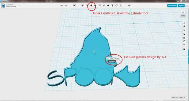 A continuación, destacar su diseño de gafas y para sacar a un grosor que desee. En el ejemplo, he asignado 1/4" como el espesor de los vidrios. Ahora, tenemos que eliminar los recortes. Extruye los recortes a una mayor altura. Saca recortes a 1".