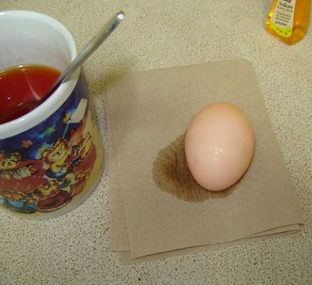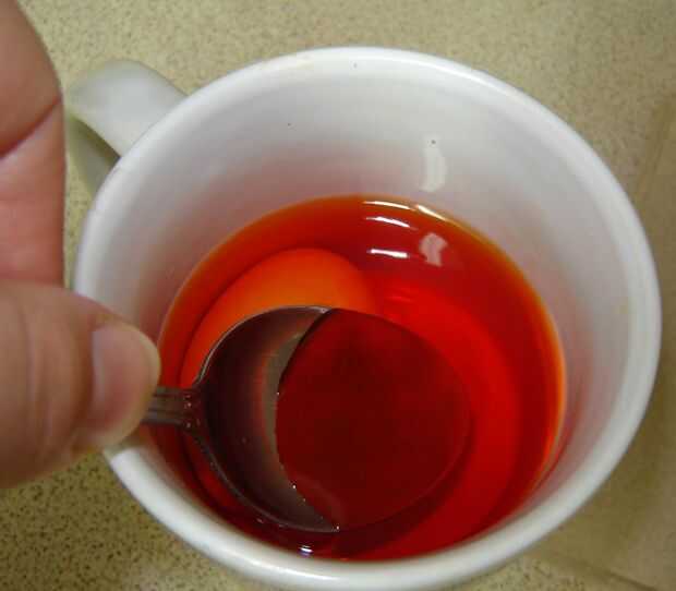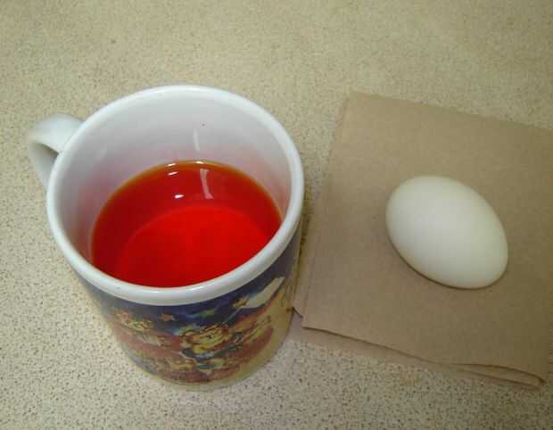 Permite que el agua fría a temperatura ambiente, sumerja el huevo completamente en el colorante, ya que es hueco y flota, necesita presionando con una cuchara. Dejarlo en hasta alcanzar el color deseado. Retire del vaso y coloque sobre papel toalla para secar.
