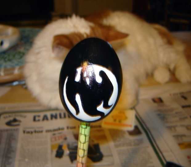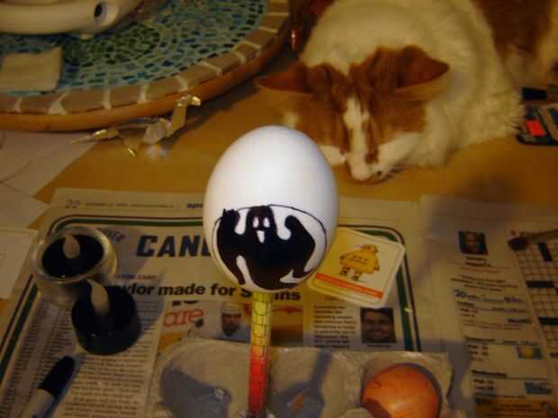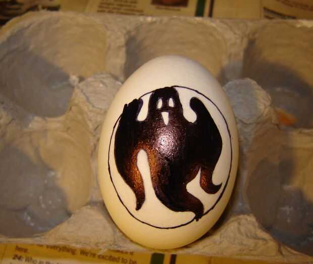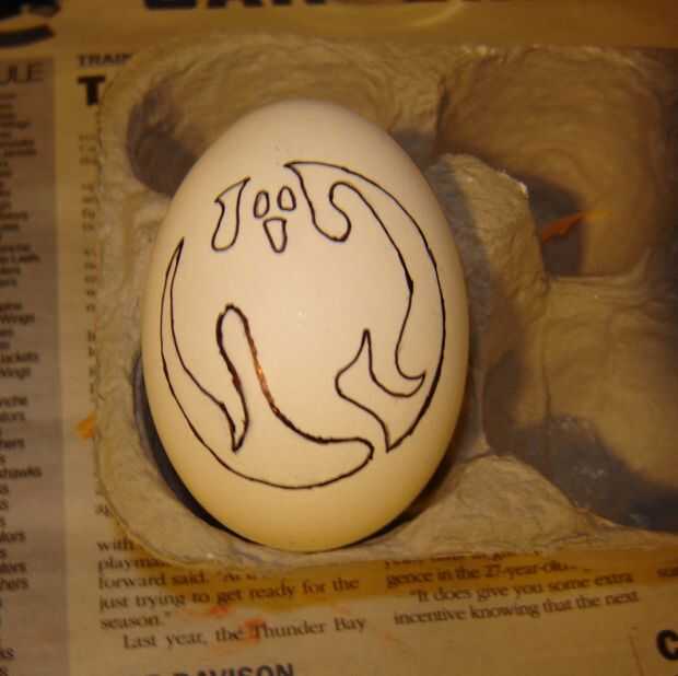 El huevo con el fantasma, pintó la mayor parte del huevo negro y deja áreas sin pintar para que la luz brille a través de, con este huevo que no me molesté tinte naranja huevo previamente, pensé que se vería bien sin él.