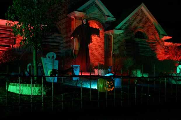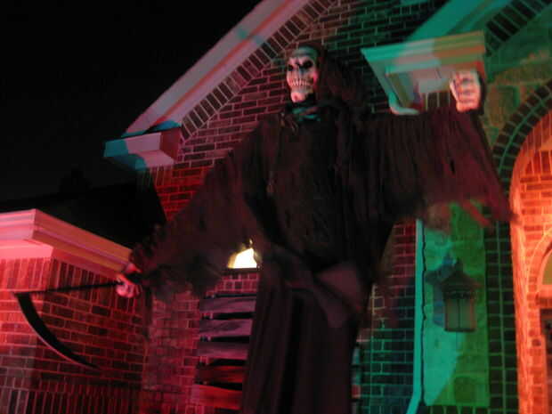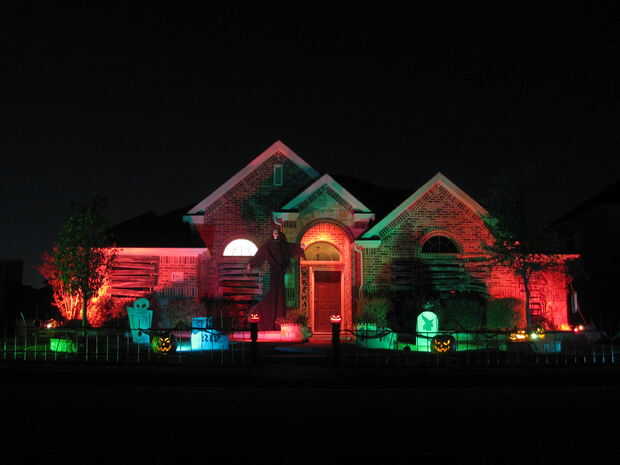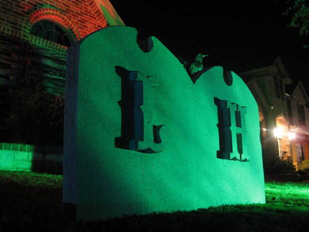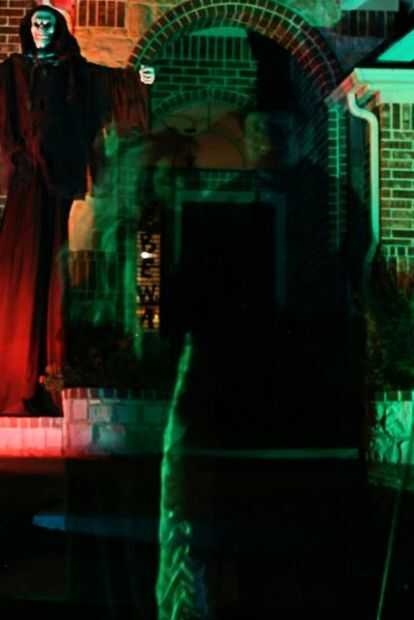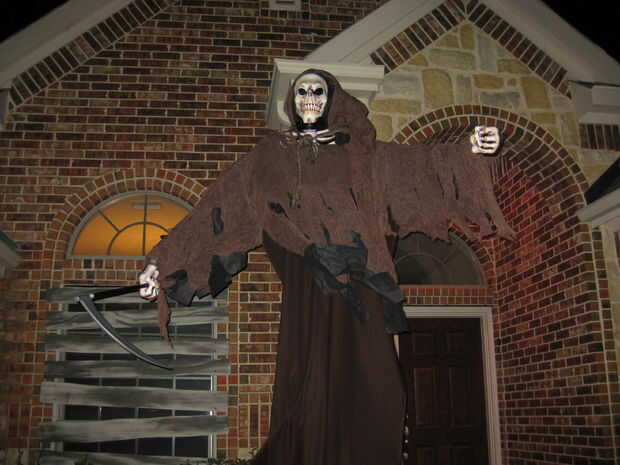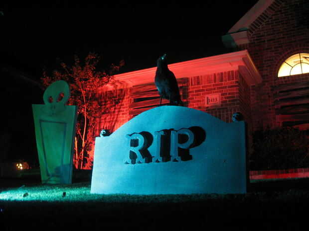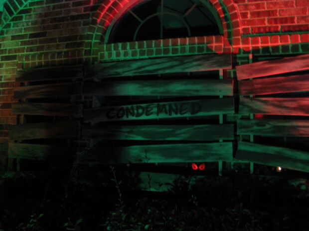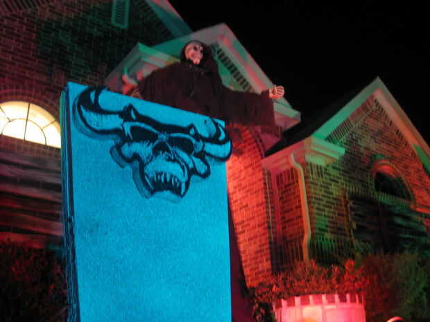 casi cada decoración es hecha a mano. En primer lugar es la valla del cementerio con 1 "x 2" por temor a tiras y 1/2" pvc. Usé 1/2" conduit como postes que fueron utilizados para conectar las secciones y seguro a la tierra. Para el toque final la cerca fue pintada con pintura de aerosol Rustoleum martillado para darle una mirada muy realista de metal. Son las lápidas todas hechas con aislamiento de espuma de la pared luego pintadas con una pintura imitación piedra. La Parca fue modificada mediante la adición de tejido extra se montaron en un asta de la bandera lo que es una figura bienvenida truco o tratamiento. La última parte está las tablas de la ventana también de 1" aislamiento de la pared de la espuma gruesa. Las tablas fueron cortadas a la medida de la junta luego equipadas para cada ventana. Una vez fueron pintadas para darles la apariencia de madera vieja. Cada decoración fue diseñado para ser almacenado y reutilizados para futuros Halloweens.