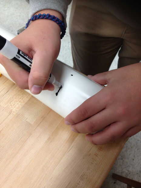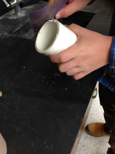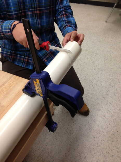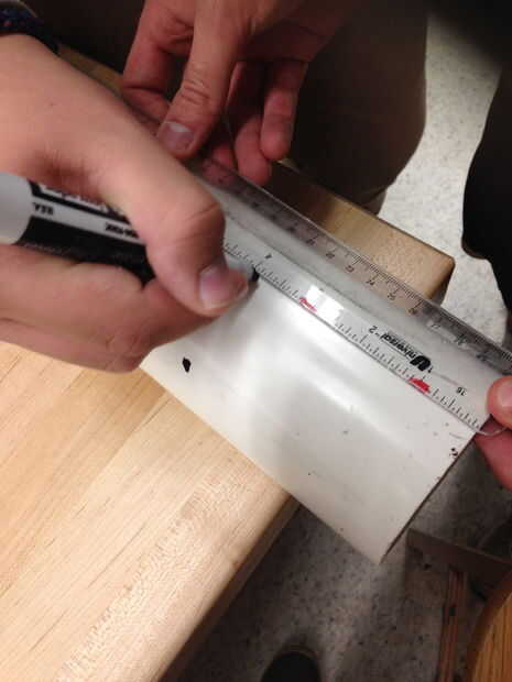 Mida y marque 4" de la gran tubería de PVC. Cuando medir hacen varios puntos que son cuatro pulgadas desde el borde el conectar esos puntos. Entonces utilizando la línea vio el tubo de PVC. Para hacer el corte liso, sujete el tubo de PVC a un banco de trabajo y que otra persona Sujete el lado que no se está cortando. Además, gire el tubo de PVC como las secciones se cortan porque será difícil que un solo corte a través de todo el camino. El tubo de PVC de la arena después de que se corta.