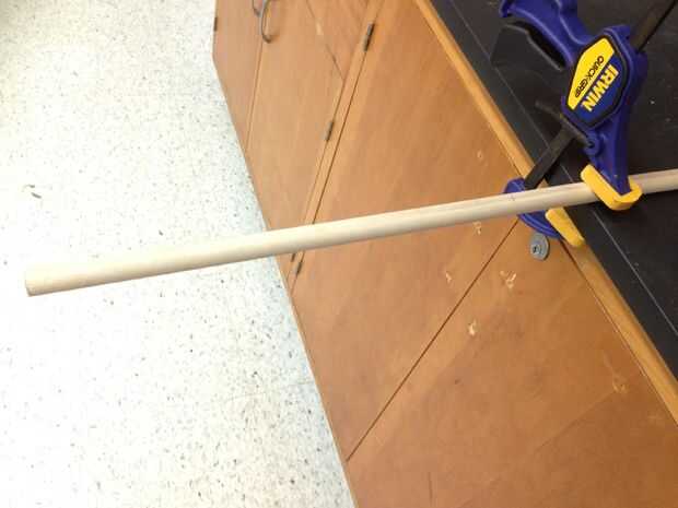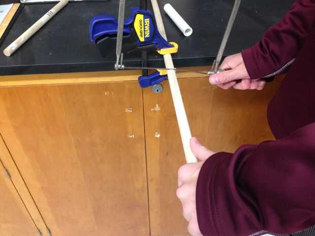 Medida/marca y corte cada pasador (12" X⅝"). Es mejor utilizar una sierra pequeña y sujete la clavija a un banco de trabajo. Para hacer el corte estable Sujete el extremo de la espiga.