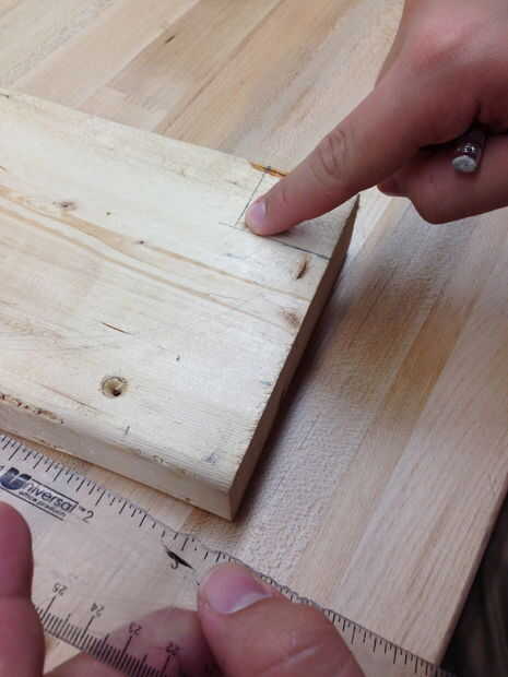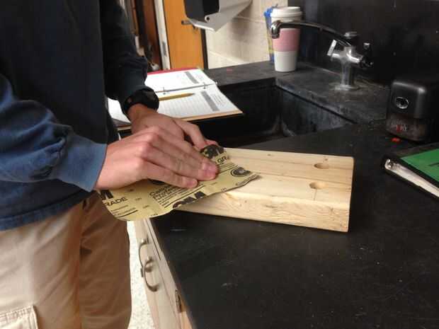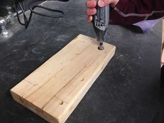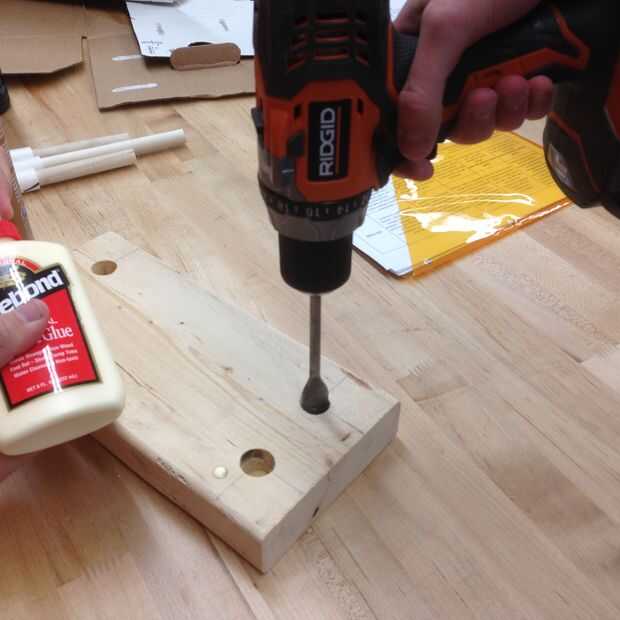 Agujero, para que el taladro se centra al punto creado a partir de la Plaza es diagonal desde la esquina de bloques. Debe ser el radio del orificio. 375". El agujero debe ser 1.25" profundo. Sane el interior del agujero hasta que el tubo de pac ajustes init apretado y ajustado. Arena el taco de madera por lo que es suave.