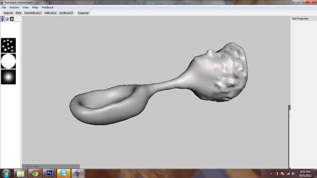 Siga Makerbots tutorial de limpieza de un modelo de aquí usando el Inspector & herramientas Autofix. También puede utilizar las herramientas de "VolBrush" para crear una forma de cuchara tirando de un tallo, expandiéndolo en una burbuja empujando en forma cóncava. Para una explicación más detallada de esto consulte la Página tutorial de MeshMixers.