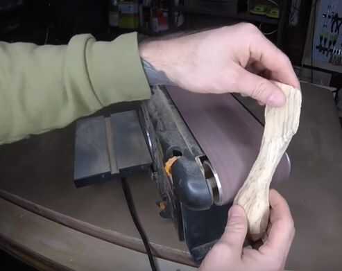 Tomó el semi-spork en forma de pieza de madera a la lijadora de banda. Esto es donde las cosas realmente comienzan a venir a la vida! Aquí puede redondear la forma de cuchara y fina por el lado de la horquilla. No olvides usar una máscara contra el polvo, a menos que quieras mocos de aserrín.
