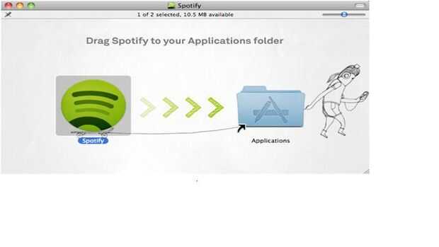 5) en la ventana titulada "Spotify", usa los cursores para arrastrar el icono verde de Spotify al icono azul de la carpeta de aplicaciones.