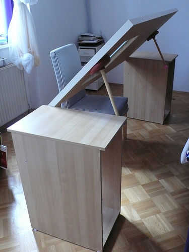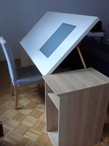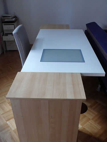 Si fuera inteligente, sería incluso calculo una manera para conectar una luz para o el interior de la tabla de extremo derecha, así la ventana de rastreo tiene incorporada fuente de luz, ahora se una lámpara de mesa apunta hacia arriba. Usted * apuesta * es de Ikea! : D Un poco quiero instalar a permanentemente una especie de lámpara de escritorio en el borde superior de la mesa, sino que aspiraría si ráfagas mis ojos cuando la mesa está en la posición plana. Sigue trabajando en esa parte.