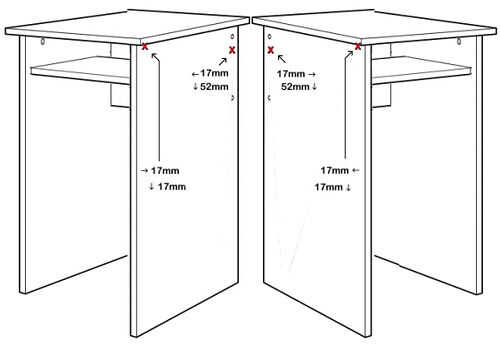 Perforar el interior pared de la parte posterior y la parte superior de las mesas. Mida hacia abajo de 1.5 x el espesor de su escritorio, en este caso, 52 mm. orificio de arrancador de 2mm, agujero final 10mm.