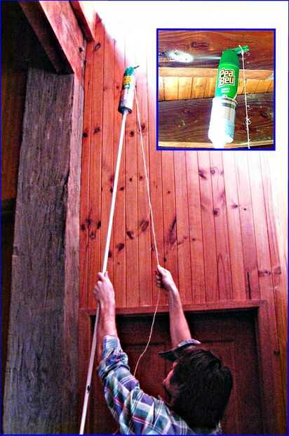 Me ponderó el problema y vino para arriba con un mango de extensión simple por una lata de aerosol de la mosca o araña para entregar una ráfaga de spray en las plagas.