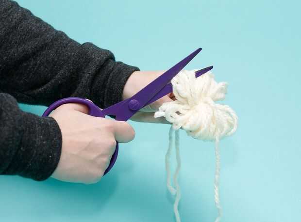 Deslice los lazos con sus tijeras y cortar por la mitad. Esto creará su pom pom. El pom pom de la pelusa para arriba con los dedos y corte lugares disparejos con tijeras. Cortar los lazos con las tijeras