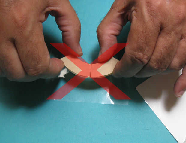 A continuación preparar la bolsa que lamina fría quitando el lado que no tiene adhesivo y descartar esa pieza. Utilizando el lado con adhesivo, con cuidado retire la cubierta protectora.