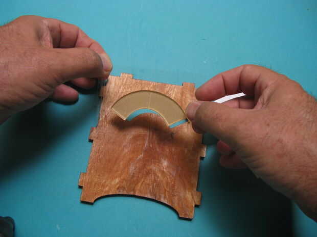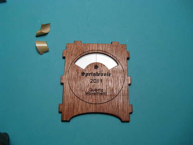 Ahora inserte con cuidado la lente en la parte posterior de la pieza frontal de la caja y liso el adhesivo superpuesto cubiertos Plasticos firmemente sobre el caso. Gire la parte frontal del reloj y retire el protector que cubre desde la parte delantera de la lente.