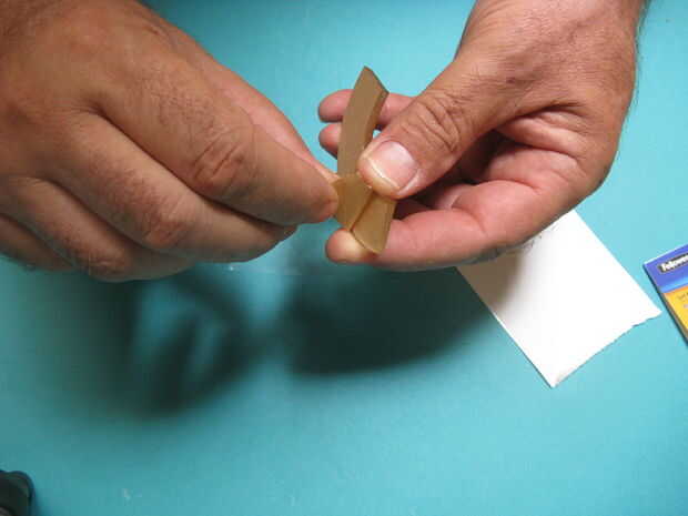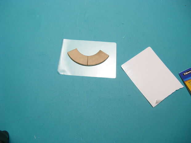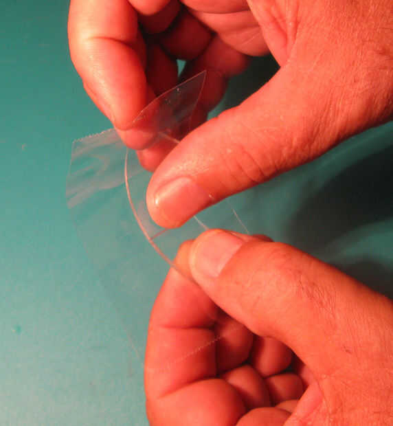 Lo que vamos a hacer es colocar la pieza de laminado plástico de bolsa con pegamento a la parte trasera de la lente. La parte que se superpone la lente va pegada a la parte posterior de la frente. Este paso es un poco molesto. Nos quiere asegurarse de que las burbujas se quitan de donde la película de plástico entra en contacto con la lente. No se sorprenda si no tienes éxito la primera vez. El truco es tocar la parte posterior de la lente con el material que lamina solamente en el centro de la lente, luego use la punta de su dedo pulgar para alisar lentamente y coloque más de la plástica en el objetivo. Cuando usted consigue una mitad hecho, hacer lo mismo para el otro lado. Lo tengo en mi segundo intento.