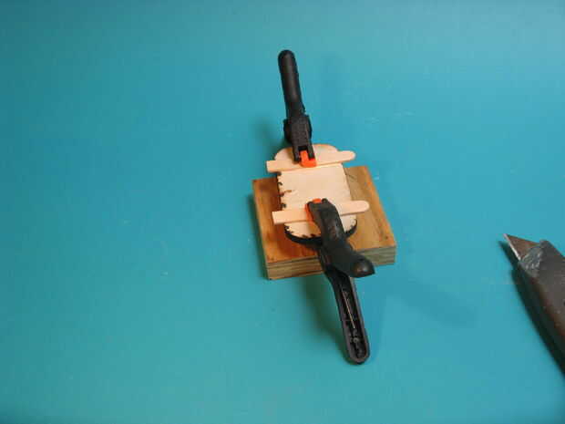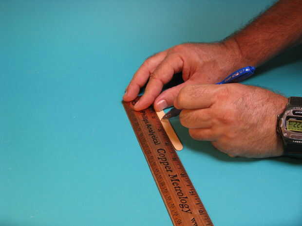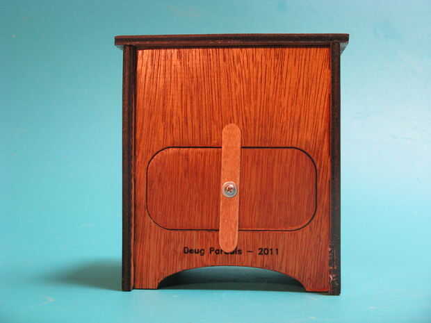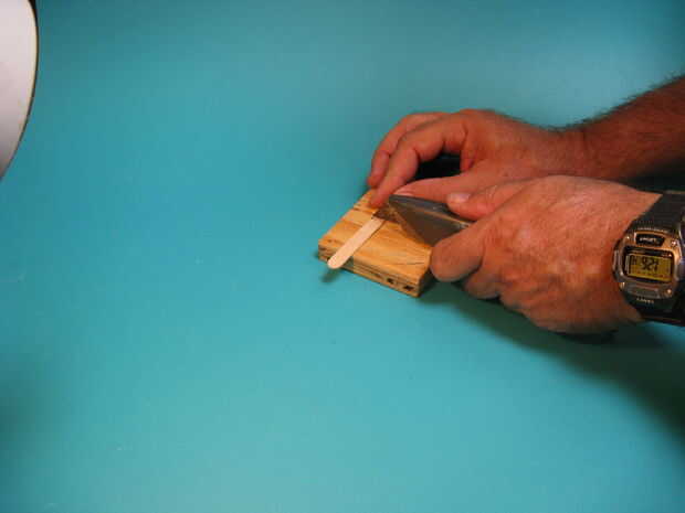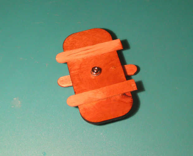 A continuación tomar el palito y cortar aproximadamente una cuarta parte de su longitud. Ronda final de la pieza larga para que coincida con el fin de no cortar. Taladre un orificio de 1/8 de pulgada (3 mm) en el centro del palo. Coloque una arandela en un tornillo de 4 x 1/2 pulgada e inserte el tornillo en el palito. Inserte el extremo del tornillo a través de la puerta. Por último, coloque otra arandela, luego una arandela y una tuerca en el tornillo y apriete. La puerta debe parecerse a la última imagen cuando haya terminado.