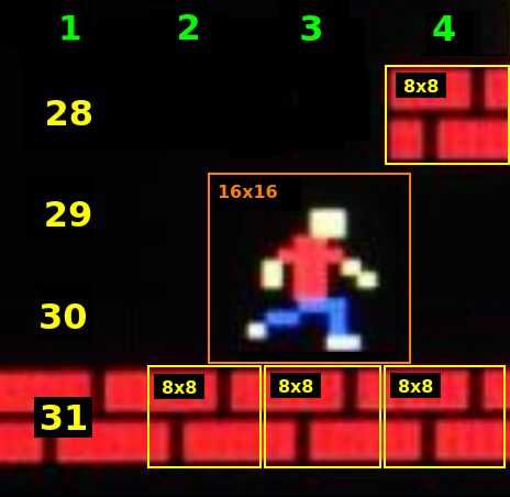 Echa un vistazo a la imagen que he unido a esta página. Observe cómo mi sprite es realmente permanente azulejos sobre todo sobre dos diferentes ladrillos de 8 x 8. Posición real de mi sprite en la pantalla es X-30 y Y-240. Tenemos que convertir estas posiciones de pixel en ubicaciones de sprites de 8 x 8. Aquí es cómo lo hacemos en BASIC.