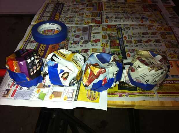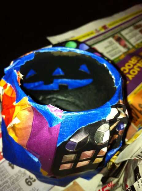 Después de tratar de averiguar la mejor manera de cubrir el exterior, colocó envolviendo toda la cosa en el periódico, y perforación hacia fuera de la parte superior. Corrí un poco más cinta alrededor de este borde superior para mantenerlo en su lugar. Sabía que esto no me daría el borde superior más limpio, pero la idea era para no estancarse en este proyecto.