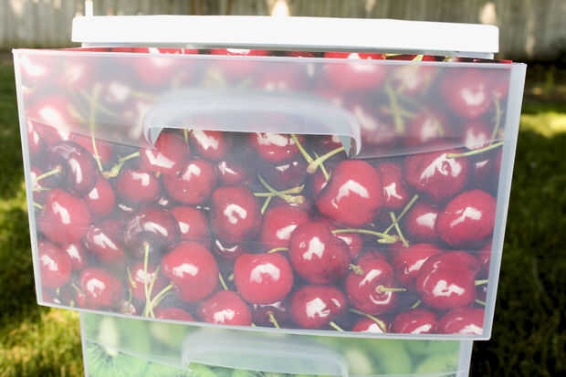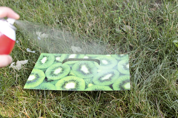 Rocíe la parte delantera de su papel. No lo sobrepulverización o puede arrugar el papel y obtendrás un lugar repulsivo pegajoso que muestra. En mi imagen con el kiwi, yo accidentalmente rociados demasiado a la derecha porque estaba rociando con una mano y tomar una foto con la otra y como se puede ver en el final.