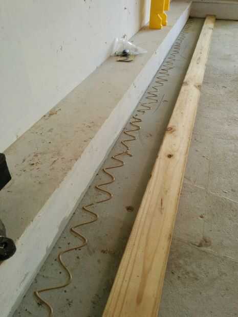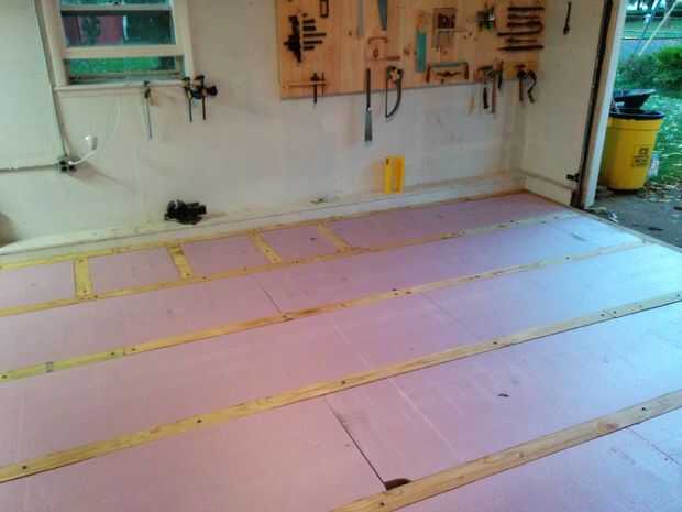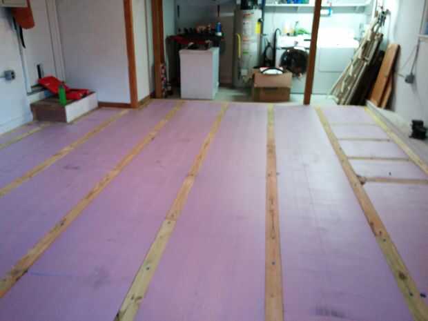 Después de completar el perímetro, continúe este proceso a través del suelo. Decidí colocar los durmientes a lo largo del lado más largo de mi espacio, era más económico así. Para su primer durmiente, extremo una pieza de aislamiento en la esquina y marque donde irá la siguiente 2 x 4. Para ello todo el camino a través del suelo, fijan el aislamiento mientras se trabaja. De esta manera no necesita medir y puede no correr el riesgo de ponerlas demasiado cerca de muy lejos.