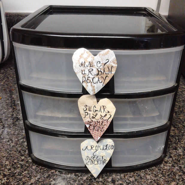 a continuación, es el momento de organizarse! He utilizado piezas de remanente del papel scrapbooking que corté para hacer coordinar las etiquetas en forma de corazón. Puedes optar por dejar claro y seguir la forma de su extracción del cajón individual. O usted puede ir con su forma favorita: estrella, trébol, perro caliente, cualquiera que sea. Recorto, etiqueta de ellos y en palo en. (Esto es donde entra la cinta).