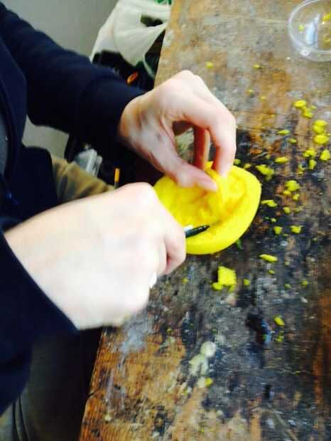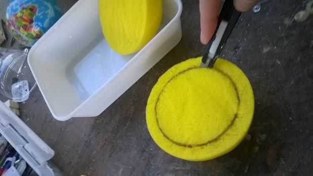 - Cortar las bolas- Utilice un cúter para cucharear el interior del Softbol hasta que la foamball quede.