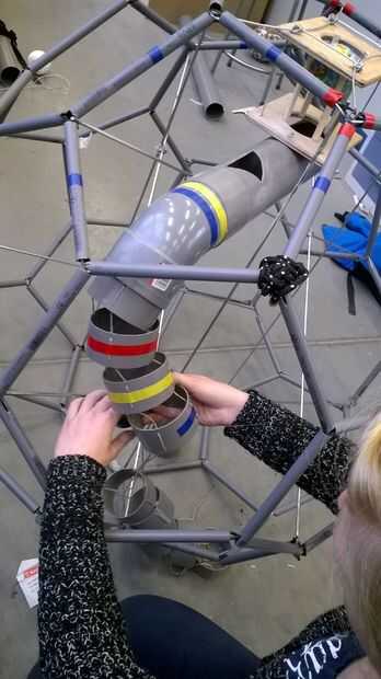 Idea: diapositiva de tubos de PVC, debido a la flexibilidad, necesita tracción y empuje la corredera para pasar el rodillo de la bola.
