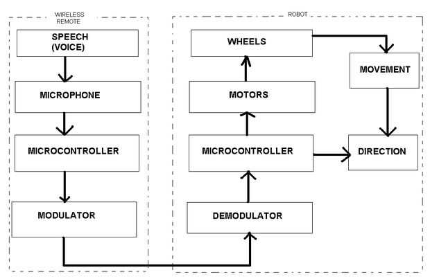 Controlar y dirigir un robot inalámbrico a través del receptor de voz remoto utilizando micrófonos y microcontrolador.