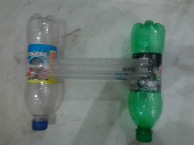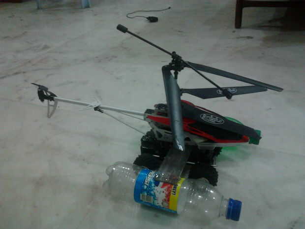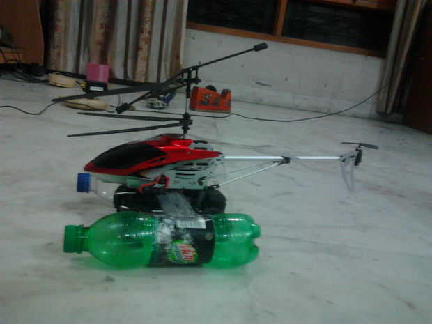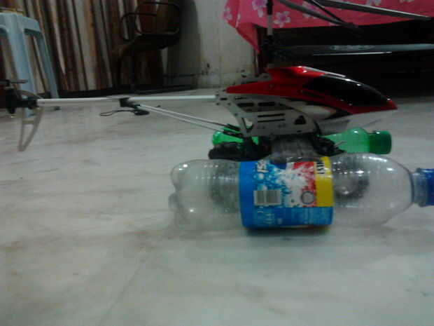 Tomar una escala y colóquelo en la parte inferior del helicóptero, fije las dos botellas vacías al final de la escala para hacerlo flotar sobre el agua. Puede utilizar un mando a distancia para ambos mediante el ajuste de la frecuencia de helicóptero cambiando el potenciómetro en el chip de cola más remotas o de lo contrario simplemente los controles remoto para el mejor ajuste.