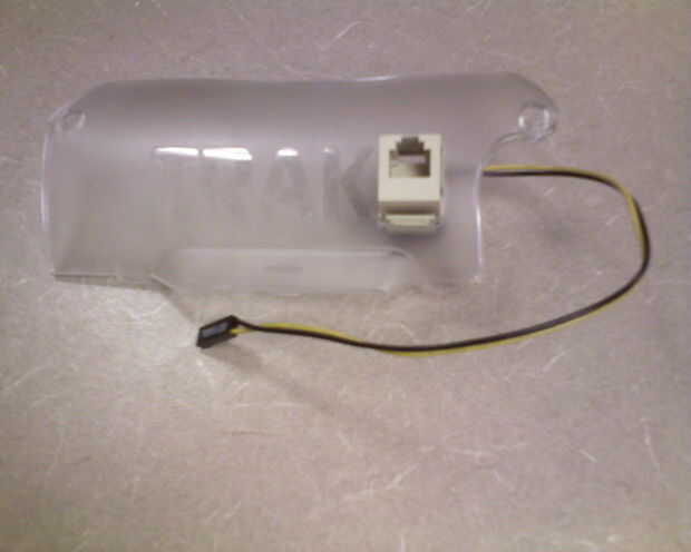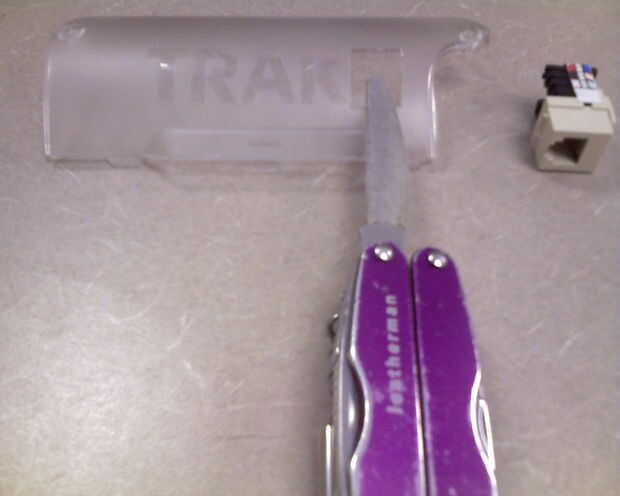 A continuación he creado un agujero en la tapa de plástico. Corte del todo «R» en TRAKR incluyendo la sombra y esto hace que el orificio de tamaño perfecto para el conector RJ12. Ver fotos 7 y 8