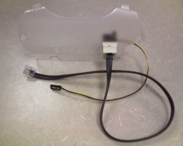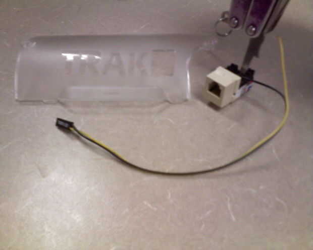 Para realizar la conexión entre el conector RJ12 y los pasadores de encabezado en el circuito Trakr, Tomé y LED Conector de y equipo antiguo (era el indicador de "turbo" para darle una idea cuántos años tenía el ordenador) y corte los cables al conector del LED. Perforado por el cable negro en el punzón de patilla 1 abajo en el conector RJ12 y el cable amarillo en el punzón de patilla 2 abajo en el conector RJ12. Ver fotos 9, 10, 11, 12, 13 y 14