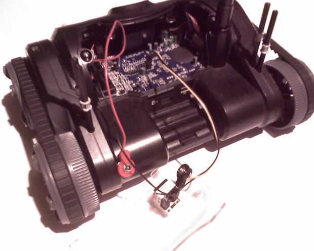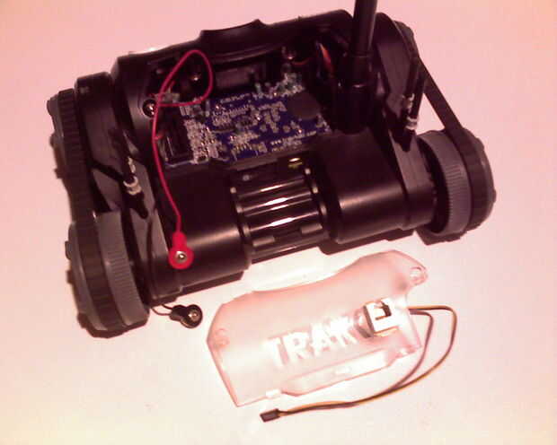 I sustituirá la cubierta plástica de Trakr. Le enchufamos un extremo del cable NXT--uno que no romper el clip de sujeción--en el NXT motor. Le enchufamos el otro extremo del cable NXT el donde interrumpir el clip de fijación, en el conector RJ12 el Trakr. Véase el cuadro 17.