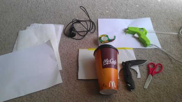 Necesita: 1 taza de café limpio (este es de McDonalds), algunos de cartón, algunas toallas de papel, pegamento y una pistola de pegamento caliente, algunos cinta scotch, un cuchillo (en este caso un puñal), un dispositivo móvil y un cargador de teléfono.