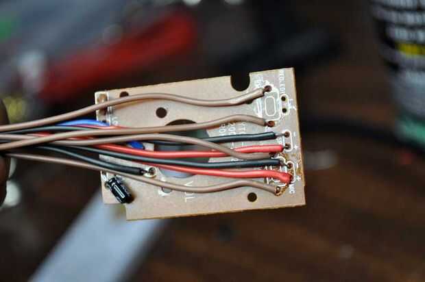 Las otras conexiones en la parte superior de la Junta están muy bien marcadas. Puede desolder y reemplace el micrófono y el altavoz con cable estándar. Quitar el LED, pero no volverlo - no usarlo en nuestro dispositivo. Finalmente, cortar las puntas de los dos interruptores (play y record) y sustituirlos con cableado estándar - no están polarizados, así que puede usar cualquier color de cableado.