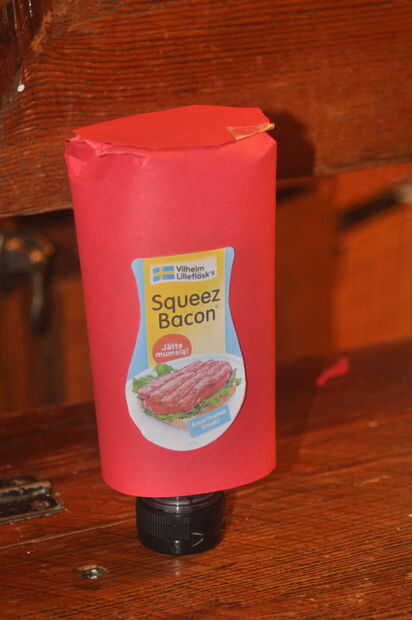 Es el momento de entrar en tu niño interior para artes y oficios. ¡ Yay! Tomar una botella de plástico que es exprimible (Asegúrese de que tiene un agujero en la tapa). Puede ser un viejo ketch-up, mostaza, cualquier botella; sólo asegúrese de que usted Lave hacia fuera. Entonces, cubra la botella en un oscuro pedazo rojo de papel. Usé cinta de doble cara para seguir juntos. Luego, tomar el picure de Squeez Bacon (encontrado aquí), imprimirlo y recortar la etiqueta. Fíjela a la botella también. Voila! Su propia botella exprimible que es similar a la Squeez Bacon uno!