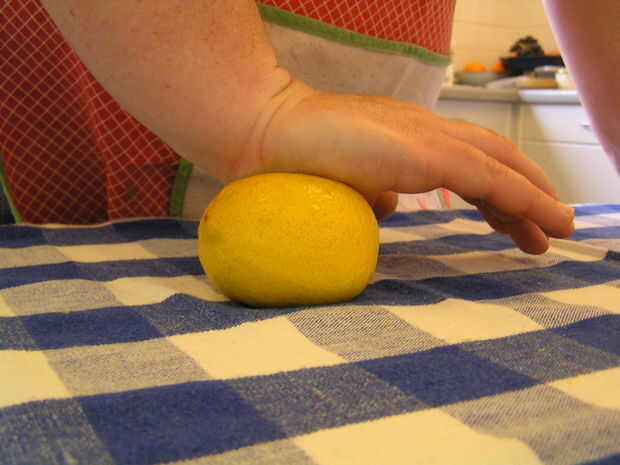 Para obtener todo lo bueno jugoso de sus limones, calabaza les con la bola de la mano en primer lugar, como se muestra en la imagen.