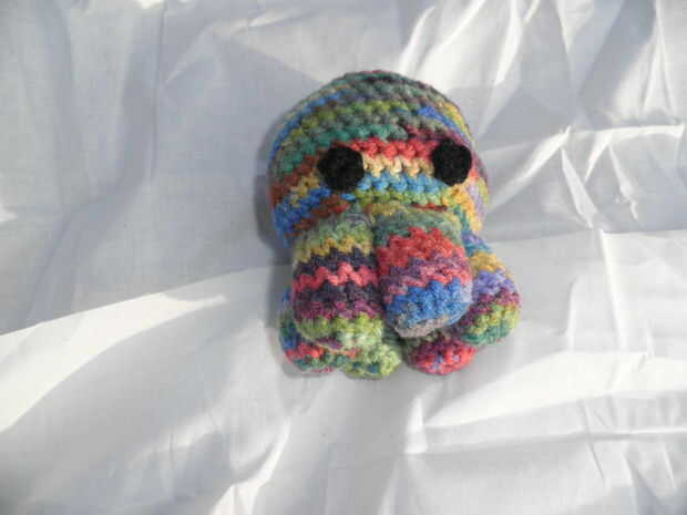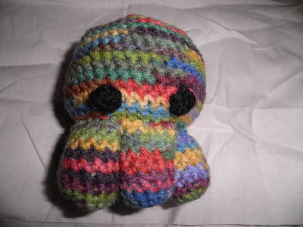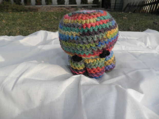 He utilizado el modelo de sitio de hilo marca del León para el pulpo. Hice 6 patas en lugar de 8 y ganchillo los ojos. Después de colocar las piernas y terminando el calamar, luego saqué un pedazo de hilo por el interior de las piernas para mantener las piernas en posición.